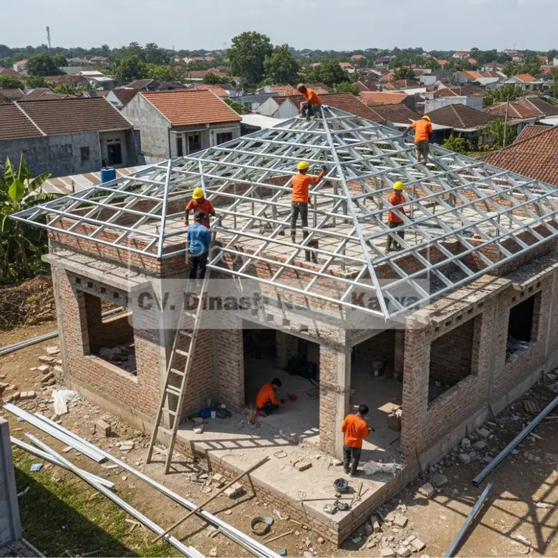 Pemasangan rangka berbahan baja ringan yang kuat, tahan korosi, dan cepat dikerjakan untuk kebutuhan atap maupun struktur bangunan modern.